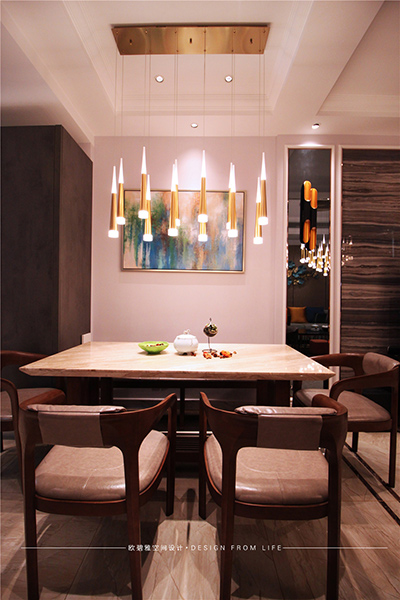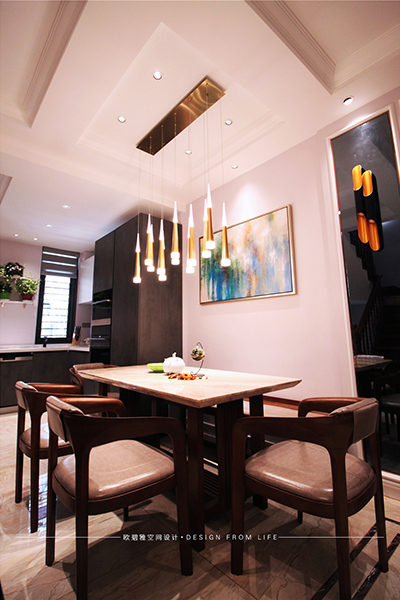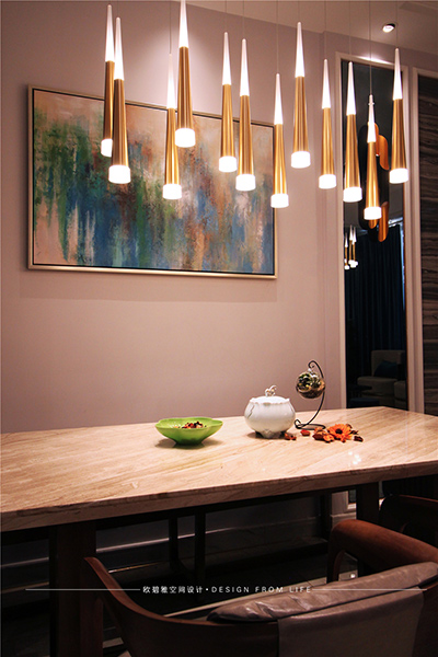 餐廳主要以暖色調(diào)為主,采用了工藝性的暖色吊燈,與客廳相互呼應(yīng),參差不齊的擺掛顯得錯(cuò)落有致,桌上橘黃色的干花,色彩上的搭配將餐廳彰顯得特別有情調(diào),給人一種低調(diào)而又不失奢華的感覺。如果此刻業(yè)主夫妻坐在這里,共飲紅酒暢聊以后的人生,又該是怎樣的溫馨與浪漫呢!