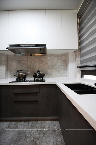 干凈整潔的廚房透漏出優(yōu)雅輕松又井然有序的氣息,白色的櫥柜門板搭配白色的大理石臺(tái)面,帶來寬敞的空間感,也強(qiáng)調(diào)了空間的設(shè)計(jì)感?;疑拇纱u花紋設(shè)計(jì)的地面,配上同樣風(fēng)格的墻面,裝點(diǎn)出如水一般純凈內(nèi)涵豐富的氛圍,讓烹飪也變成一種藝術(shù)。