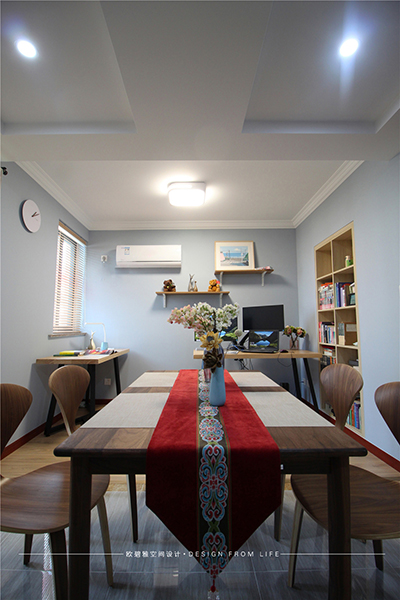 書房與餐廳互通,既滿足了平時(shí)忻先生的日常辦公又提升了空間的使用頻率。經(jīng)典的及木家具風(fēng)搭配獨(dú)特的配飾、宛如藝術(shù)心靈的沖撞,一切是那樣舒緩、給人沉迷家的感覺。