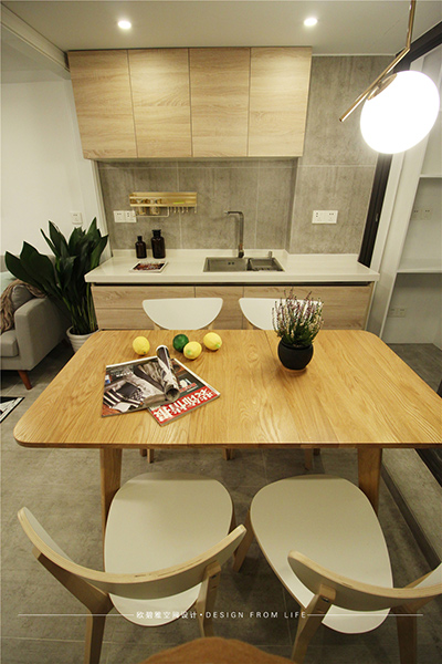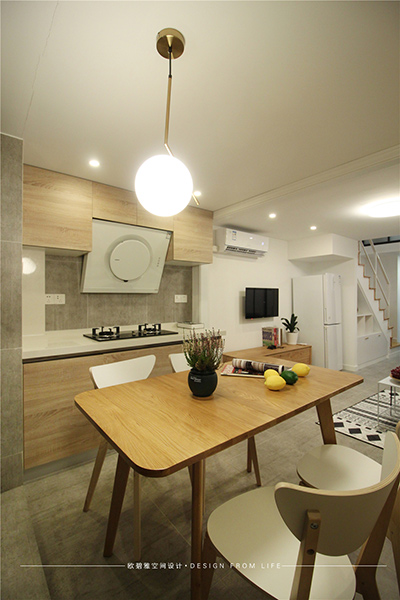 餐桌上方不規(guī)則的金屬吊燈和糅合的燈光組合相得益彰,晚上一家人坐在一起吃飯、談心、暖暖的色調(diào),暖暖的氛圍。在風(fēng)格上沿襲北歐家具的一貫特征,精煉簡潔,線條明快,造型緊湊,更接近自然。