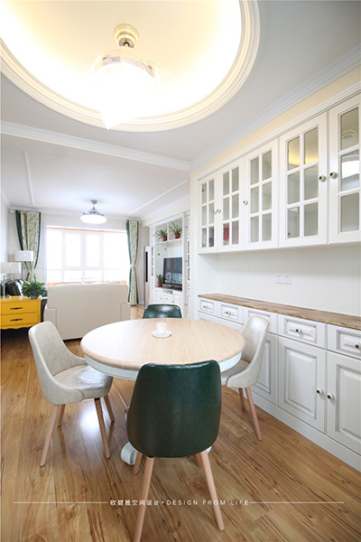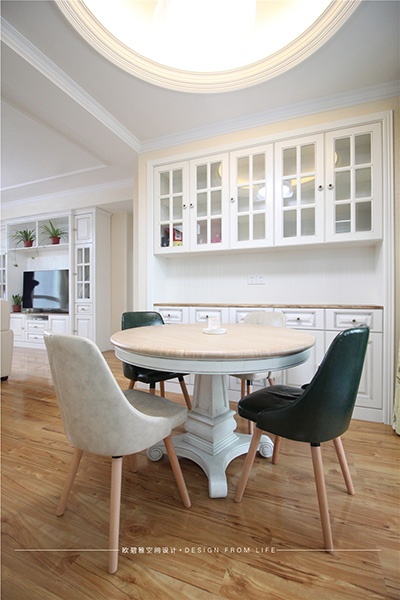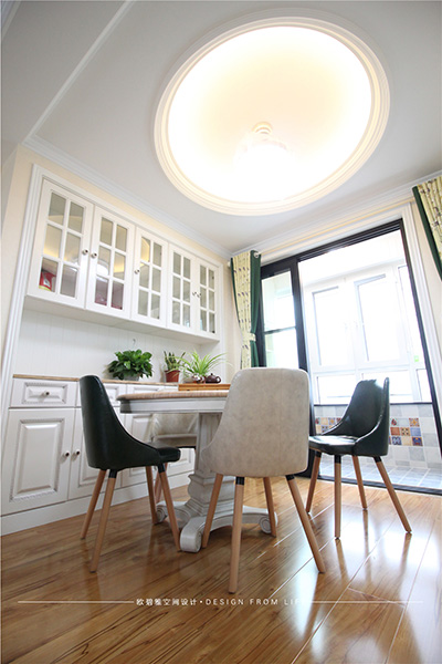 餐廳與客廳的空間應用全通透,既滿足了使用功能又增添了空間視線互通。在燈具的選擇上也注重冷暖搭配,色彩呼應,經(jīng)典的家具搭配獨特的配飾 宛如藝術心靈的沖撞。業(yè)主非常享受在餐桌上辦公,用他的話說“陽光很暖、氛圍很好”。