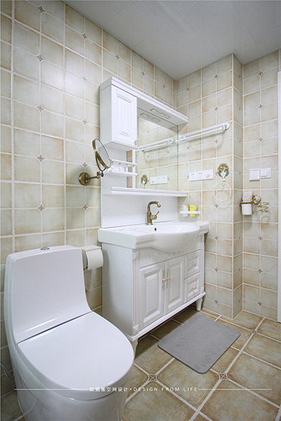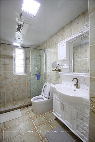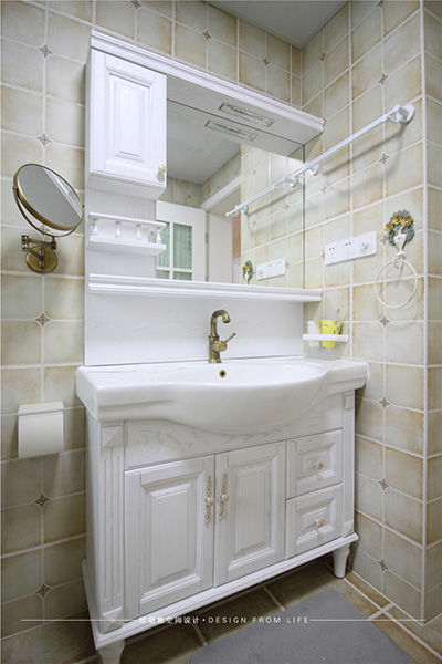 衛(wèi)生間的設計、干濕分離、因為是坐北朝南的房子,采光與通風兼具,洗浴門用玻璃隔斷,簡約通透、現(xiàn)代感十足,洗手臺銅鏡的搭配,別致新穎,打造溫馨浪漫的小資情調(diào)。
