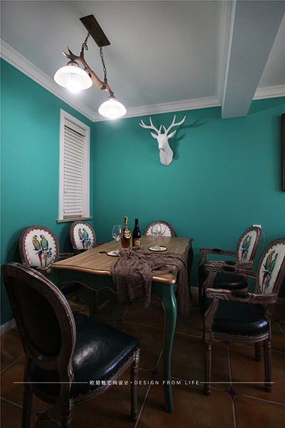 本案的設(shè)計營造浪漫、自由、高雅的古典風(fēng)格,給人帶來自然舒適、悠然輕松的生活情趣。墻壁上的鹿角和吊燈搭配著古典的美式家具,豐富了空間的視覺效果,呈現(xiàn)出了美式的自由豪爽。